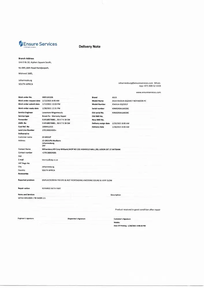 Collection was arranged and on the 26th of February 2020 the table was collected. As per the pick-up note the table was in excellent condition and the only issue was a faulty leg (Pick-up note attached) . The guys that came to pick-up even mentioned that the person who assembled used the wrong amount of *****s and something was missing. They assured my parents who were present at collection that the problem was caused by assembling and the obligation to repair is of the store. My father, Ambrose Mlindeni Khumalo who is also a former employee of Bradlows also agreed to the statement posed by the guys who collected.
