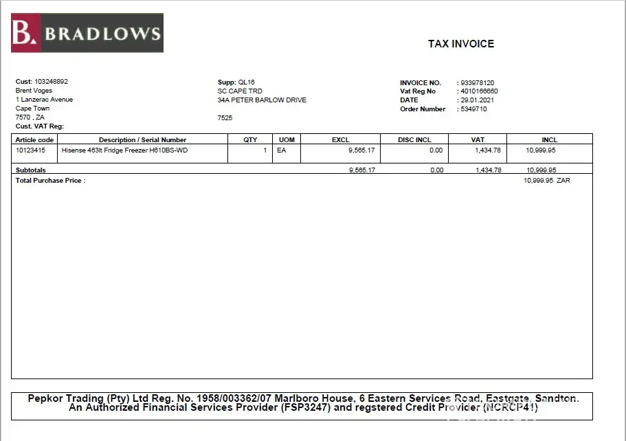 I took delivery of a fridge on the 29th Jan 2021.