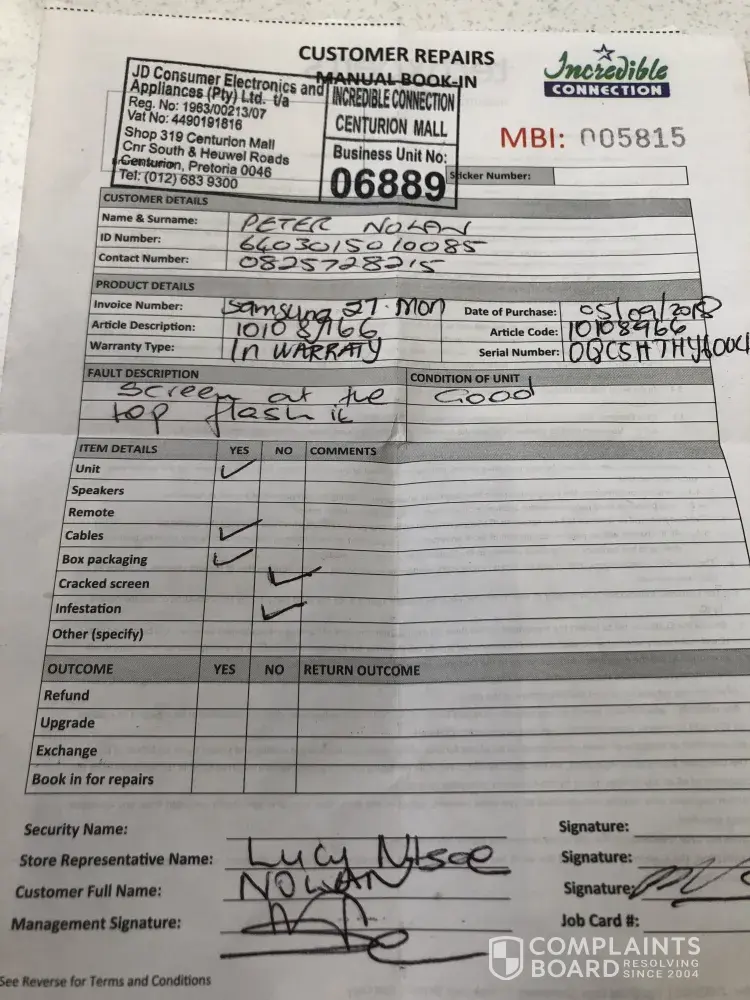 I purchased a 27" Samsung monitor that has a 4 year warranty. On 20 August 2019 the screen started to flicker so i brought it to the Centurion Incredible Connection, i was assured the device would be collected within 3 days and sent to the repair centre for assessment, i was assured i would receive a call on 21 August for an update. After trying to phone the branch on 0126839300 and not getting an answer i drove to the branch. I spoke with the Technician Lerato and Kevin the Branch Manager explaining i am due to leave the country on work responsibilities for 4 months, expecting to depart within the next 14 days and have nobody who they can contact to collect the unit once it is decided to repair or replace. I was assured i would be kept up to date on progress. Today 30 August after again not being able to get through on the contact number i again drove to the store for an update. I asked for an update from the Technician who had no idea of the monitor and went looking for the checkin slip. On returning she informed me that the monitor had been collected on 27 August (10 days it was in the store after i was assured faulty items are collected within 3 days!) She also had no update on the progress and when i asked to speak to Kevin she suddenly remembered that the repair centre had called her at 09:00 this morning to ask what the fault on the monitor was? The same Technician then started completing the book-in sheet which was blank? I wanted an update and all she could tell me is that they are waiting for feedback from the repair centre upon which i insisted she phone them for an update as they were not answering their phones or providing feedback as promised i also asked to speak to Kevin and was told he is out, at 14:30 in the afternoon? When i asked her to get hold of him on his cell i was informed that they do not know what his cell number is? I asked the Technician to get an update, i had other business to do in the centre and would return. On leaving the store i saw Kevin having a smoke and talking to a Hi-Fi Corp person near the parking paystation. I walked up to him and relayed my frustration, he was adamant that the unit had been collected within 3 days and not on 27 August as per the document i was shown. I informed Kevin i would be back expecting an update. I am not too happy with the general "Dont Care attitude and the rolling of eyes" i have been met with today. Additional to this there is no ownership to deal with this query instead i was met with "Lerato did this and i dont know what is going" on approach