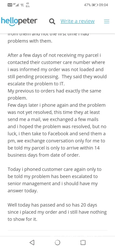 You have a tracking system to track online orders, it however does not reflect what is happening, my order was being prepare, the next minute I get a call to say my goods are at my gate, no call to confirm if I will be there? Just open we want to deliver? My mail indicates the delivery date, I also sent a number of follow up mails to ensure that my goods is not transported Unnecessarily and it being damaged.