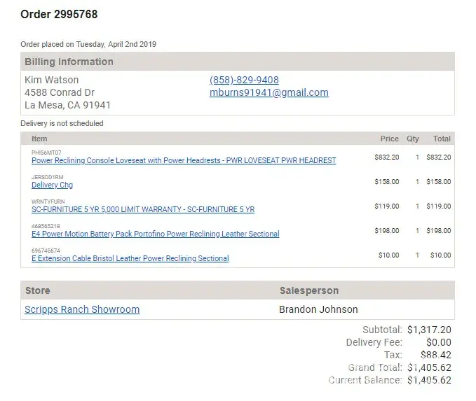 On 4/1, we purchased (what we believed to be) a reclining piece for our TV room. Our order number was 2994068. When it arrived, it was an incorrect piece. It was a sofa, when we had actually wanted a loveseat. We contacted the store, and a new order was created 2995768. The invoices are for $1473.75 (old) and $1405.62 (new). I have since learned that...