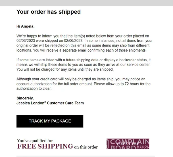 My first online order with Jessica London is also my last (May 2022). Somewhere in the first order is the caveat that you are signing up for a monthly members club charge which awards free shipping. I definitely didn’t get free shipping, and didn’t want a membership. Do not order from them or their affiliates!