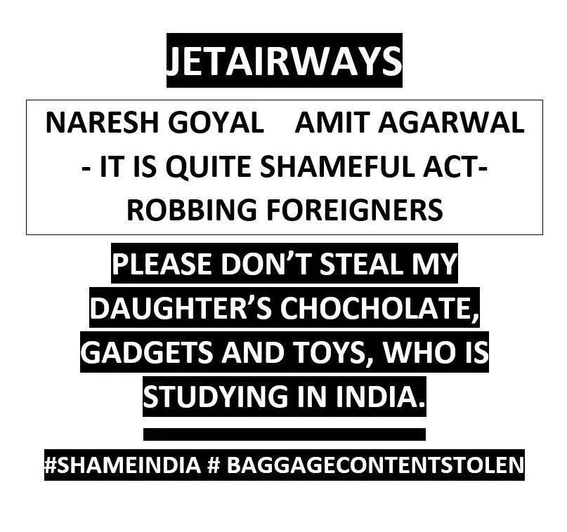 Jet airways which is one of world's worst airline chaired by Naresh Goyal, stole content of my baggage and in last few months, there is no relevant response and desire to provide resolution or fix, Mr. Narendra Mansukhani and Kavya shetty lied to me time and again and now hiding like a petty thieves, after airline / its staff stole my expensive Sony headphones, chocolates and toys of my daughter ( totaling around 1000 $ ) which I bought for her on birthday who is studying in India.