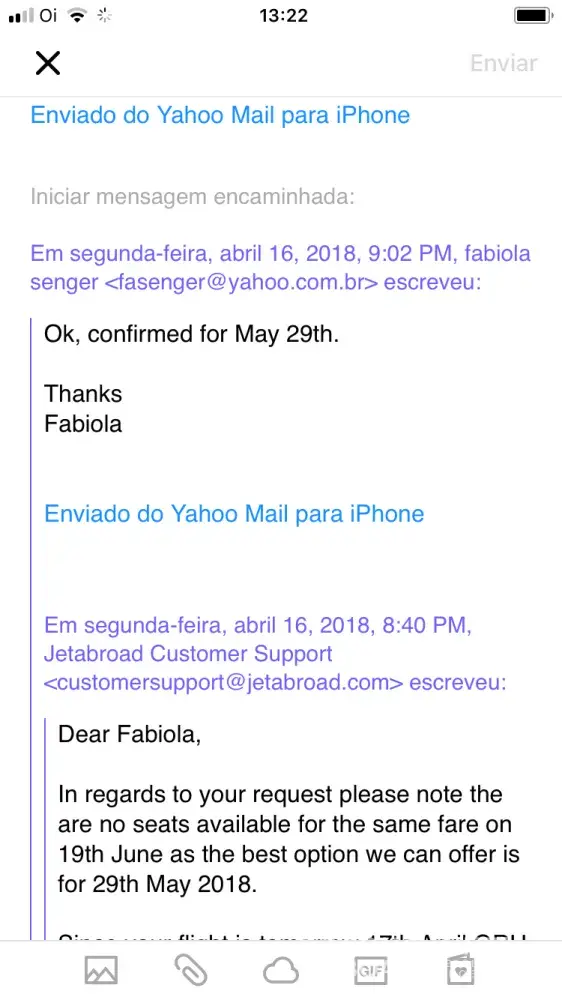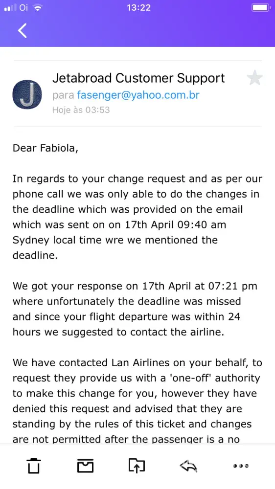 Dear Lacer. We have searched our customer correspondence and we can't find a record that matches the issue you describe. Can you please provide your booking reference and we will investigate. customersupport@jetabroad.com
