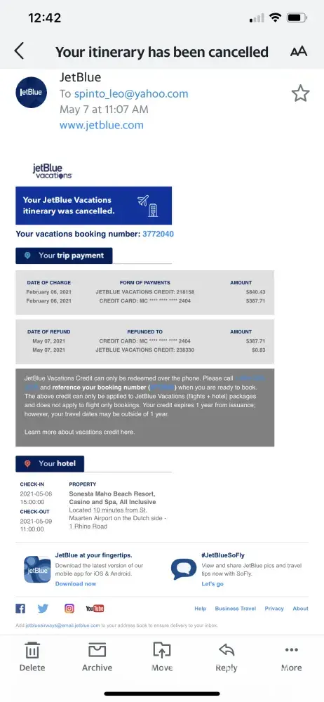 My husband and I had a vacation package from EWR to SXM on 5/6 returning on 5/9/2021. We missed the flight due to St. Maarten not emailing my authorization to travel. We were rescheduled for a flight the next day out of gate 22. I received an email that the flight will be delayed and departure will be at 9:25 am. By 9 am, there was no calls for our flight. I heard commotion at the counter where people were upset over gate changes without being notification. I approached the counter and was told my flight was at another gate. Several minutes later I was told I was told we had to go to a different hanger for out flight. We ran, went through metal detectors but arrived as the plain was pulling out. They offered to reschedule us for Saturday but our return day was Sunday and had to work on Monday. I called customer service and they said they could give me a credit which I declined and demanded my money back. They processed a reimbursement for the airline portion but not the hotel and told me that because I didn't go, I could not be reimbursed. I was informed that JetBlue will be emailing the hotel and it would be up to them if they would reimburse. I demand the entire hotel cost which is $840.43 be reimbursed back to my credit card as it was the airline failure that we missed the plane.
