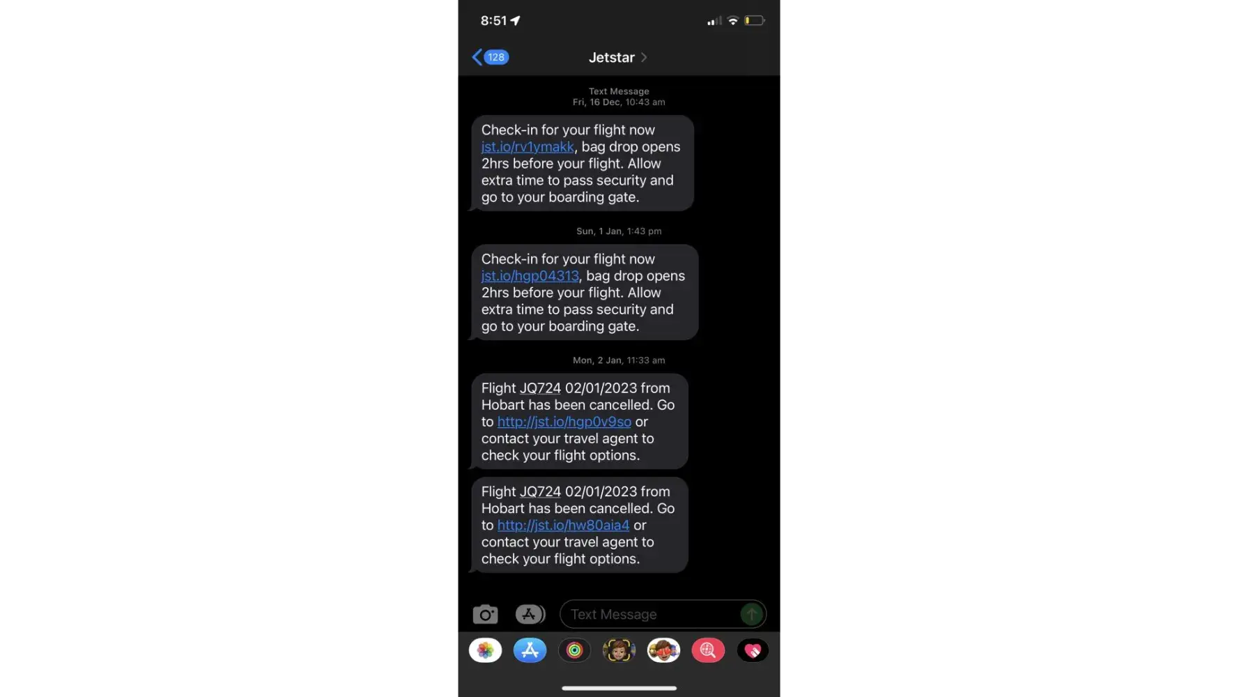 I booked a Jetstar flight (JQ724) for the whole family (5 people) to fly from Hobart to Sydney on the 2 January 2023. The flight was scheduled to take off around 7pm. I received a couple text messages from Jetstar at 11:33am on the 2 January saying that our flight was canceled with a link to find options. It's less than 8 hours before the take-off.