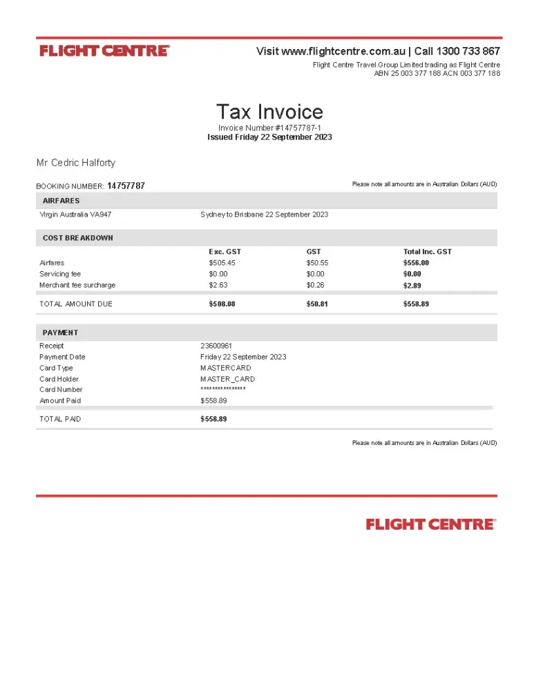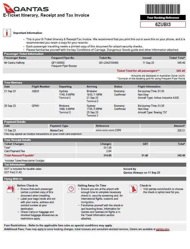 I booked my flights from Perth to Melbourne (15-19 Sept 2023) on 22nd Aug,23.