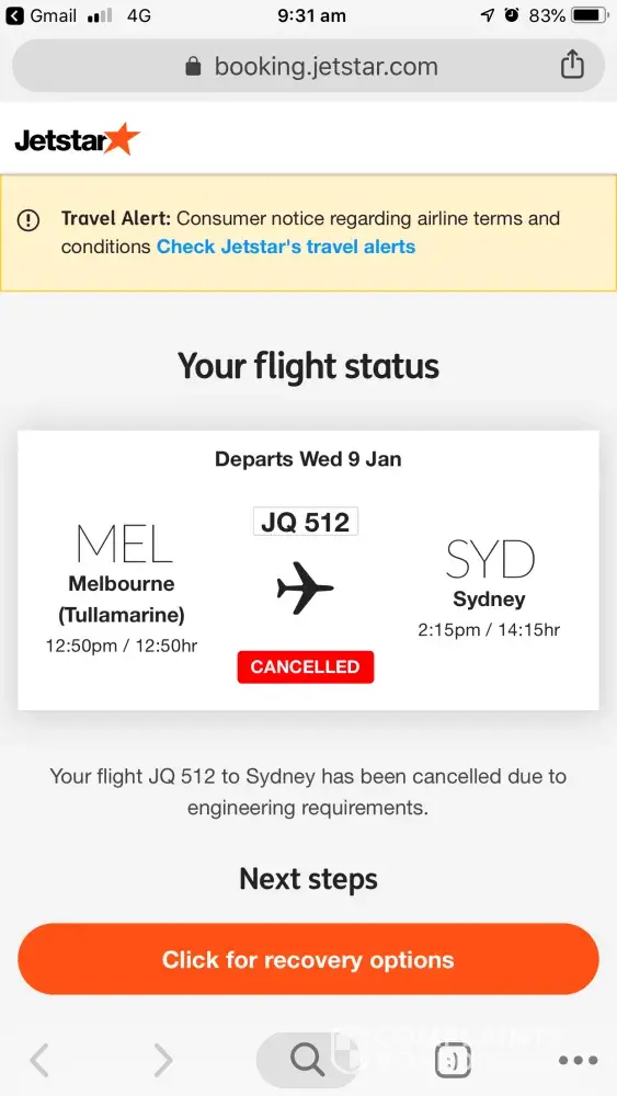Flight JQ 512 Mel to syd on 09.01.19 was cancelled as I was on route to airport by text