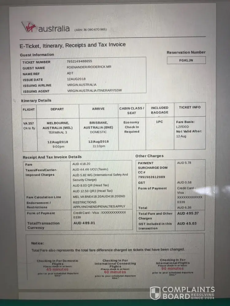 I was booked on a return flight to Melbourne on August 4th at 1450.