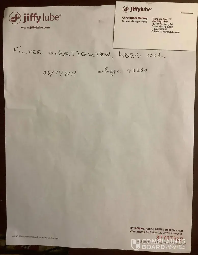 I also visited two other Jiffy Lubes in order to obtain information about their services with these types of cars. I asked for information for an oil change on this car type of car (Dodge Sprinter 2003) and they said that they would do it. When I insisted and asked whether they had the filter in the store they backed up and said that they didn’t have it, and that they only did the oil change on those cars. This confirmed that they never did a filter change the first day that I took the car because they do not do filter change according to the other Jiffy Lubes. They also said that the diesel filter was something they didn’t do commonly either, that if I were to ask for that service they would do the same thing the other people did with my car, leave the filters untouched and once you turn on the car with the old filters after changing the rest the oil gets contaminated and causes the rest of the problems.