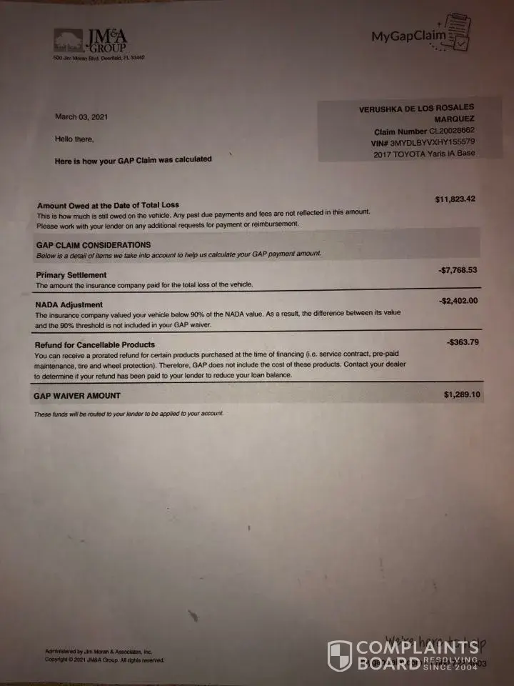 They sell you a gap insurance for 900$ offering to pay the amount your car insurance wont cover after a total loss, and then they value your car for a ridiculous high amount and say they wont pay the difference! I paid for 2 years 900$ for gap insurance and they just paid 1200$ for my car of a 4500$ amount that is still owned for the car! Leaving my family with over 3000$ in debt we can't afford in the middle of a pandemic! Jim Moran put me through a nightmare! My car was a total loss due to no fault of mine and now I don't have a car and I'm 3000$ dollars in debt I can't afford! My credit would be ruined because of this cause there's no way I could pay for this without a car! I went to complain at the dealer TOYOTA OF HOLLYWOOD and they couldn't believe whats happening to me and told me they will review keeping on working with them! They couldn't believe this company won't cover the gap and leave me with all that debt and I'm gonna file a complaint against both the dealer TOYOTA OF HOLLYWOOD who SOLD ME their policy promising me they would save me from debt in case of an accident and Jim Moran & associates with the State of Florida Insurance Department and Better Business Bureau! Whats the point of buying a 900$ total loss protection insurance policy if they wont cover nothing? I attached the estimate they gave me that there's 2400$ of "NADA Adjustment" they wont cover! They valued my car at 11.900$ and the real value of the car according to my insurance appraisal and the Kelley Blue Book is 8200$! The dealer just laughed when I told them the value they used said that's delusional thats absolutely not the value of my car! I will make my life's mission that everybody knows about this scam and that the dealer and Jim Moran cant keep scamming people and ruining their lives leaving them in debt! I attached the estimate they give and the total loss protection amount I purchased in my contract! RUN RUN from this company! It's a BIG calculated SCAM!
