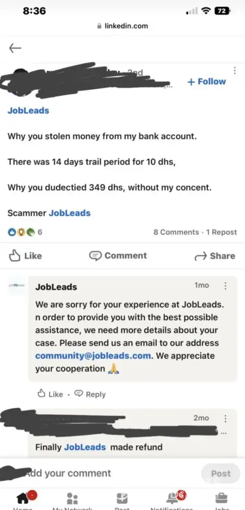 It sounds like JobLeads pulled a sneaky move with their "free trial," charging you 349 dirhams without clear warning or your consent. Having a small upfront fee only to surprise you with a big charge later is definitely shady, especially without proper notice. With other people having the same issue, it’s clear this isn’t an isolated incident. Hopefully, they refund your money quickly — nobody signs up for unexpected charges like that!