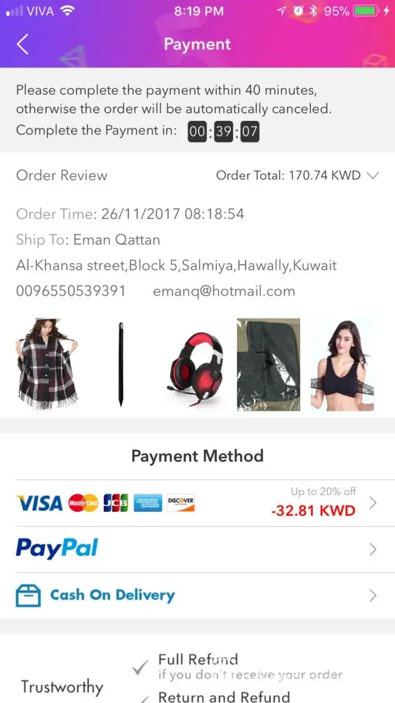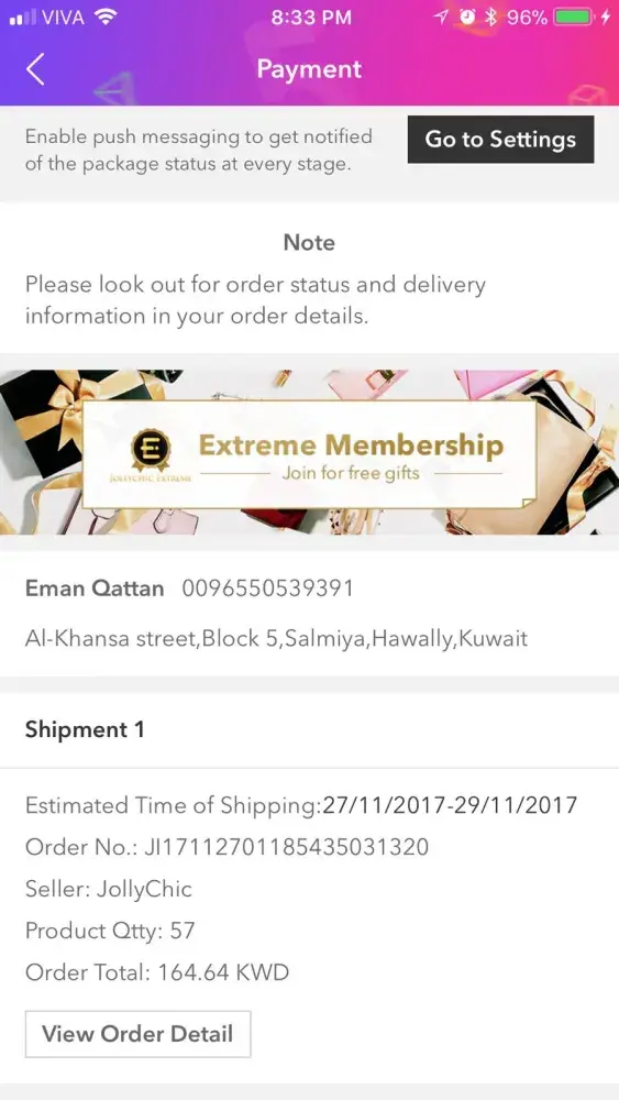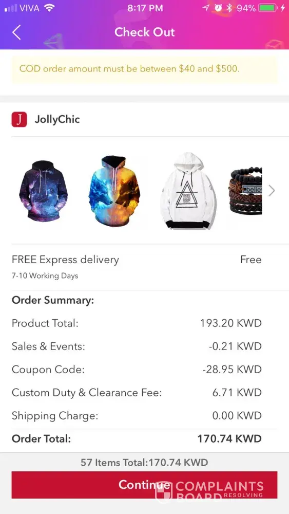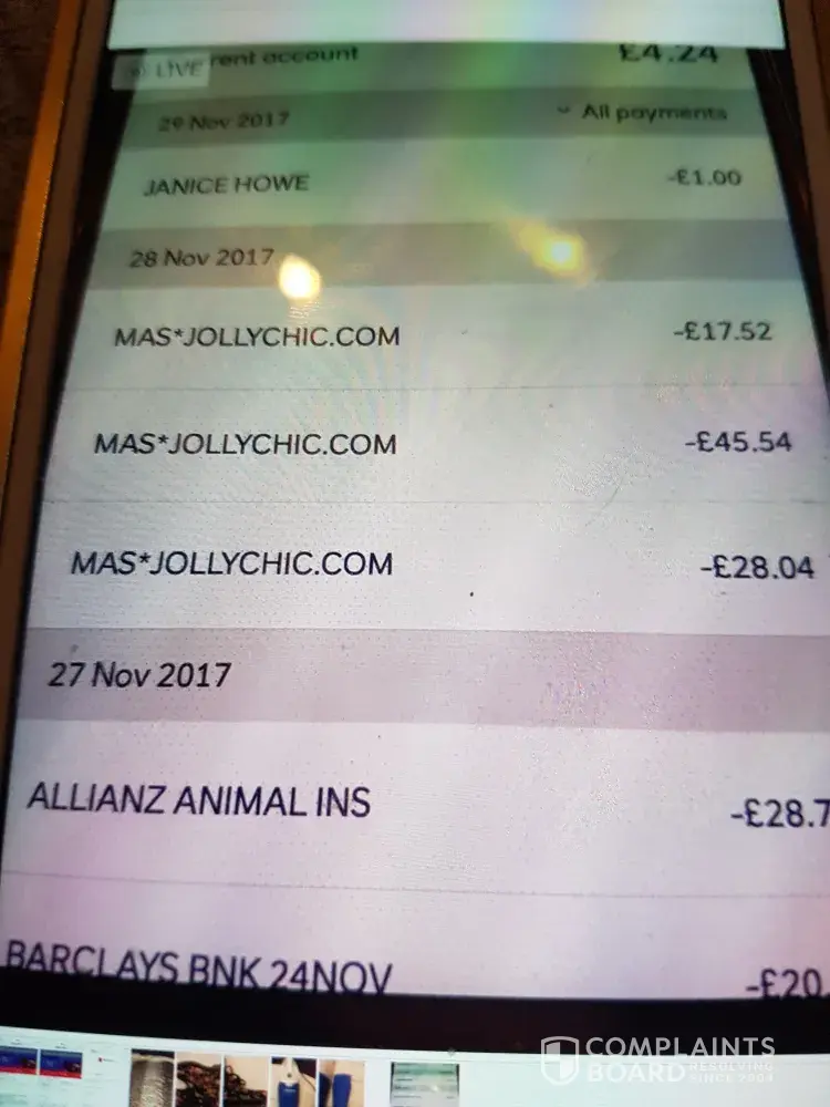 1- On 26th November, , we placed an order on Jolly chic online website order No: JL17112701185435031320 of total KD 193.20. and there was a Sales & Events Discount of KD 0.21 and Coupon code discount of KD 28.95 in addition to some extra fees of KD 6.71 for Custom duty & Clearance that made our total amount KD 170.74 (Attachment 1)
