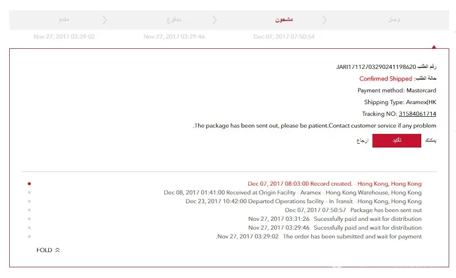 5- A call was made to Jolly chic Kuwait contact number (Attachment 5) clarifying about if every thing about the order is ok and it was a chance to inquire about the discount of KD 32.81 that disappeared during payment process unfortunately we got no clear answer about the discount od KD 32.81.. we understood that something is unclear that may went wrong. and we ignored the discount of KD 32.81, , since it shows that there was a discount for using credit card of $ 20 (not at all like KD 32.81 but better than nothing) .. and during the call we inquire about the order status and we were informed clearly that everything ok and under process and order on it is way for delivery as scheduled.