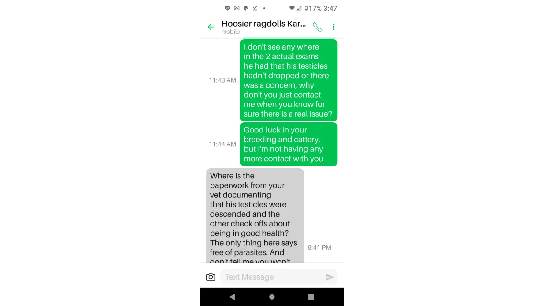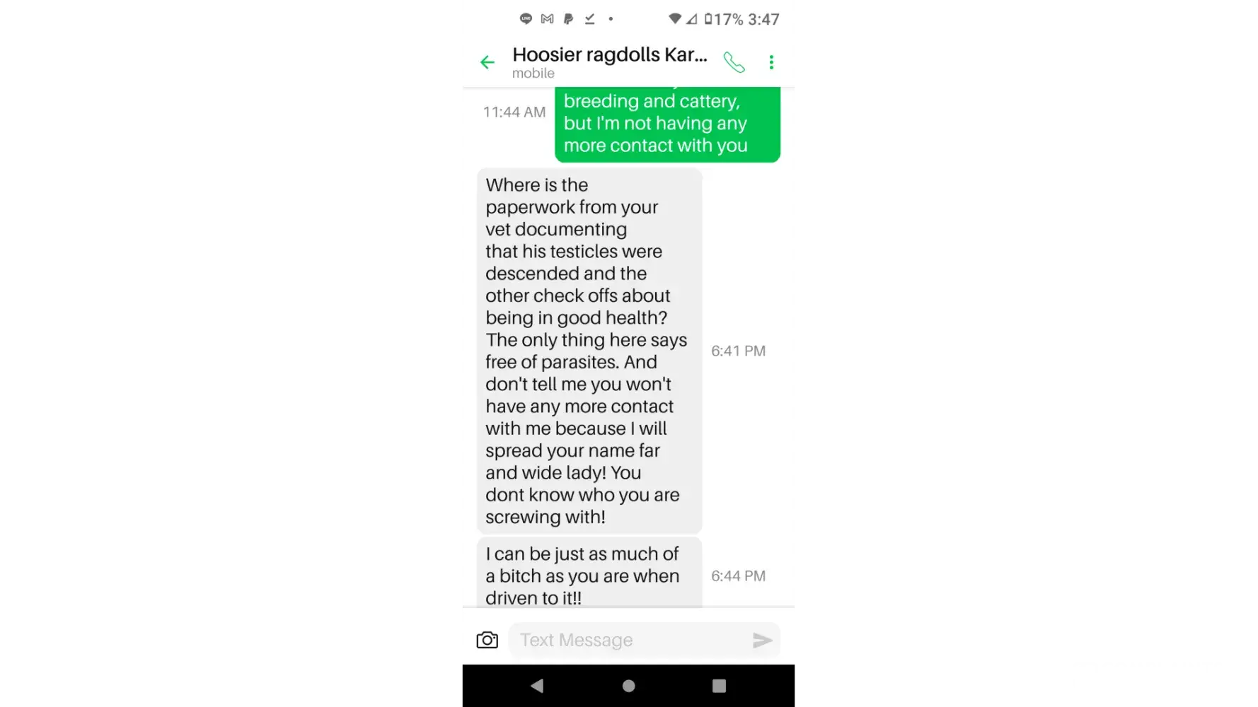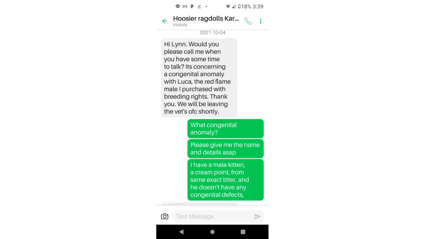 She contacted me 10-04-22 stating for me to call her about congential anomaly with Luca, the red flame male I purchased with breeding rights. i'll be leaving the vet office shortly. I was so scared for him, I thought he was taken in for a life threatening defect, by the urgency in her text.Come to find out wasnt even seen at the vet that day. I asked for the vets name and muber to talk with him and thats when she admitted he was a "ride ago" so she says and there was no record of him at the vet that day. After that I wasn't sure what to believe any more, she has done this many other times too that I mention in another complaint. I told her at that point good luck in your breeding and cattery but I would not have any more contact with her. That infuriated her, she loved talking to me on a regular basis. She called me a [censored] and* and said she would spread my name far and wide, that I didn't know who she was screwing with. Karen Morris had never sent me one text or email with any documention from a vet stating Luc has cryptorchidism. Karen if you have any text or email sent [protected] from a vet showing documention that received proof of cryptorchidism we would all love to see it. If he has this issue I was never prodived with proof and after her cussing me, name calling and threating to slander me, I have since blocked her. Beware to all breeders dealing with her . I usually mind my own business but after Karen filing a complaint saying I'm an unethical breeder, I am forced to file a complaint with the things she has told me going on in her cattery.