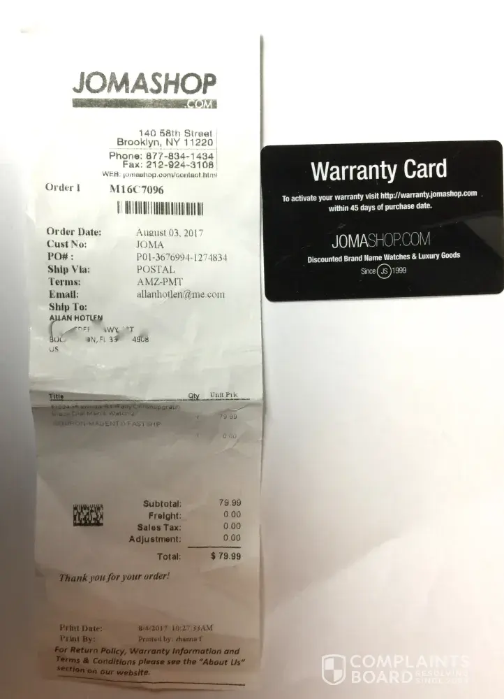 It is clear Jomashop does not have a customer service culture- their senior managers are not involved in ensuring good service.