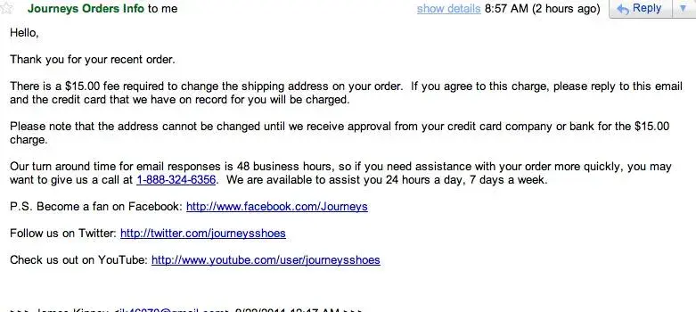 Journeys asked me to pay a $15 fee to have my order sent to my son's address instead of mine. So I asked them to cancel the order, which had not yet been paid by my bank. They told me the order could not be cancelled.