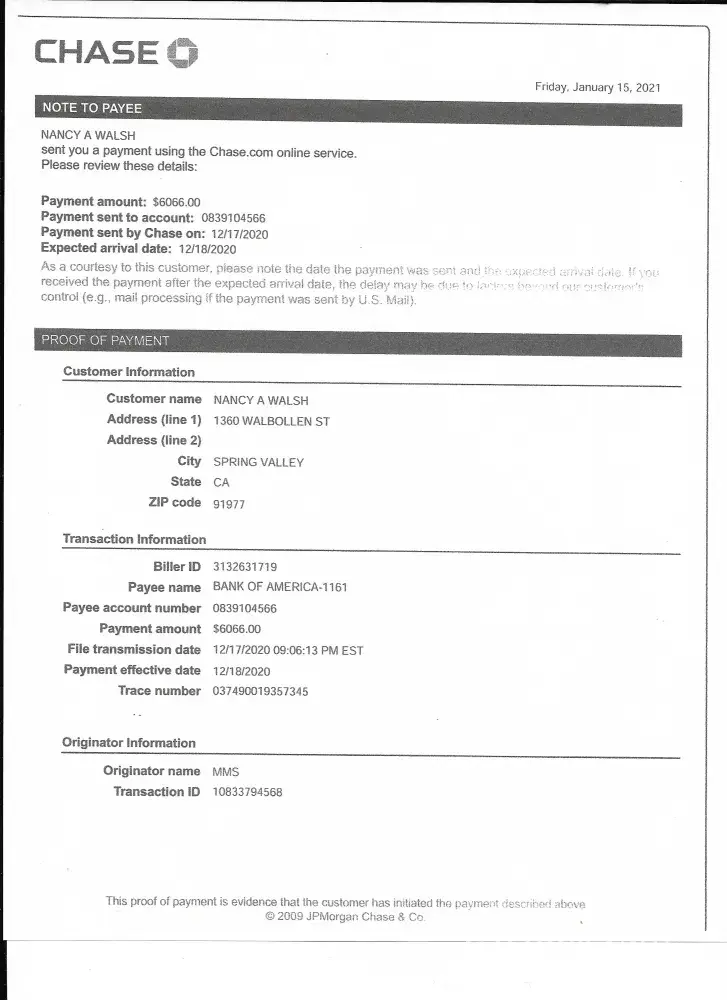 I initiated a transfer from my checking account with Chase Bank to my checking account at Bank of America on 12/17/20 for the amount of $6066.00. I have made numerous phone calls to both banks and been transferred to many different departments for the last several weeks. Neither bank will help me. Chase says it was successfully electronically transferred and Bank of America says the transfer was never received. I filed a "dispute" and was notified that their records show the transfer was sent on 12/18/20 and they had no way to research it. As of today I still do not have my money and have not received any advice on how to get it back.