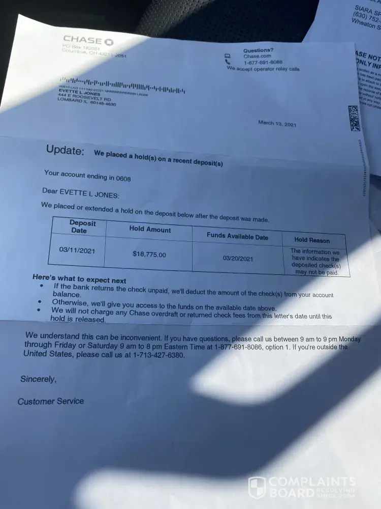 On March 13, 2021 I received another letter stating that Chase had placed an extended hold on my account due to information they received that the check I used to open up the account might not be paid.