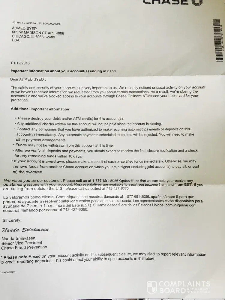 I had a Chase checking account for over 10 years and I have had direct deposit set up on this account the entire time from the same company. Chase decides to close my account 1 day before my direct deposit went in. Then they tell me that because my account is closed I have to wait 3 business days for the direct deposit check to process and then they will send me a cashiers check in the mail in 7-10 business days. No advanced warning. No notice. Still no valid reason as to why the account was closed. I spoke to many customer service reps and they all give me the runaround and lies. They transfer you to a bunch of different depts and they all say something different. And they will not give you a number to file a complaint or contact an escalation dept.