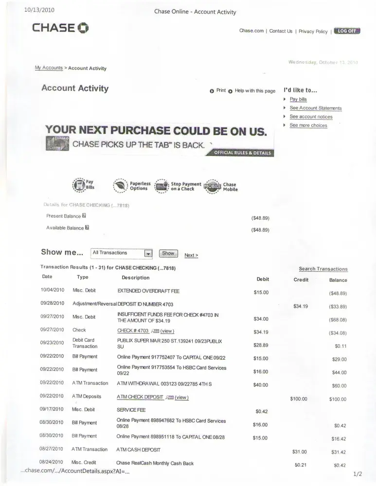 I once again notified my Chase Bank through the number located on the back of my ATM card. I was told that I needed to go to the branch in person and that the overdraft fee would be refunded. And for my security they would put a freeze on the account, until I visited the branch to open a new account. A few days went by and I received another e-mail notifying me that my account was overdrawn again. I once again notified Chase and was told that although they reversed the original transaction for $34.19, that caused the overdraft. They could not reverse the overdraft fees associated with it because it was not a fault of their own that caused the overdraft to occur. My account now sits at -49.00 (34.00 Overdraft Fee, and $15.00 extended overdraft fee) because of a check they elected to go through at their discretion. If you ask me, they are attempting to profit off of my misfortune at their discretion. So I will be writing on every website and Federal Banking and Business Commission and Regulator at my discretion. I'm mad as hell and I'm not taking it anymore!