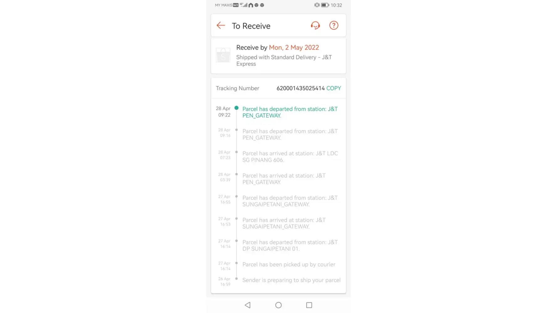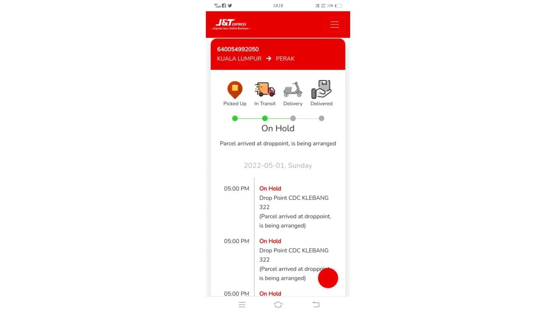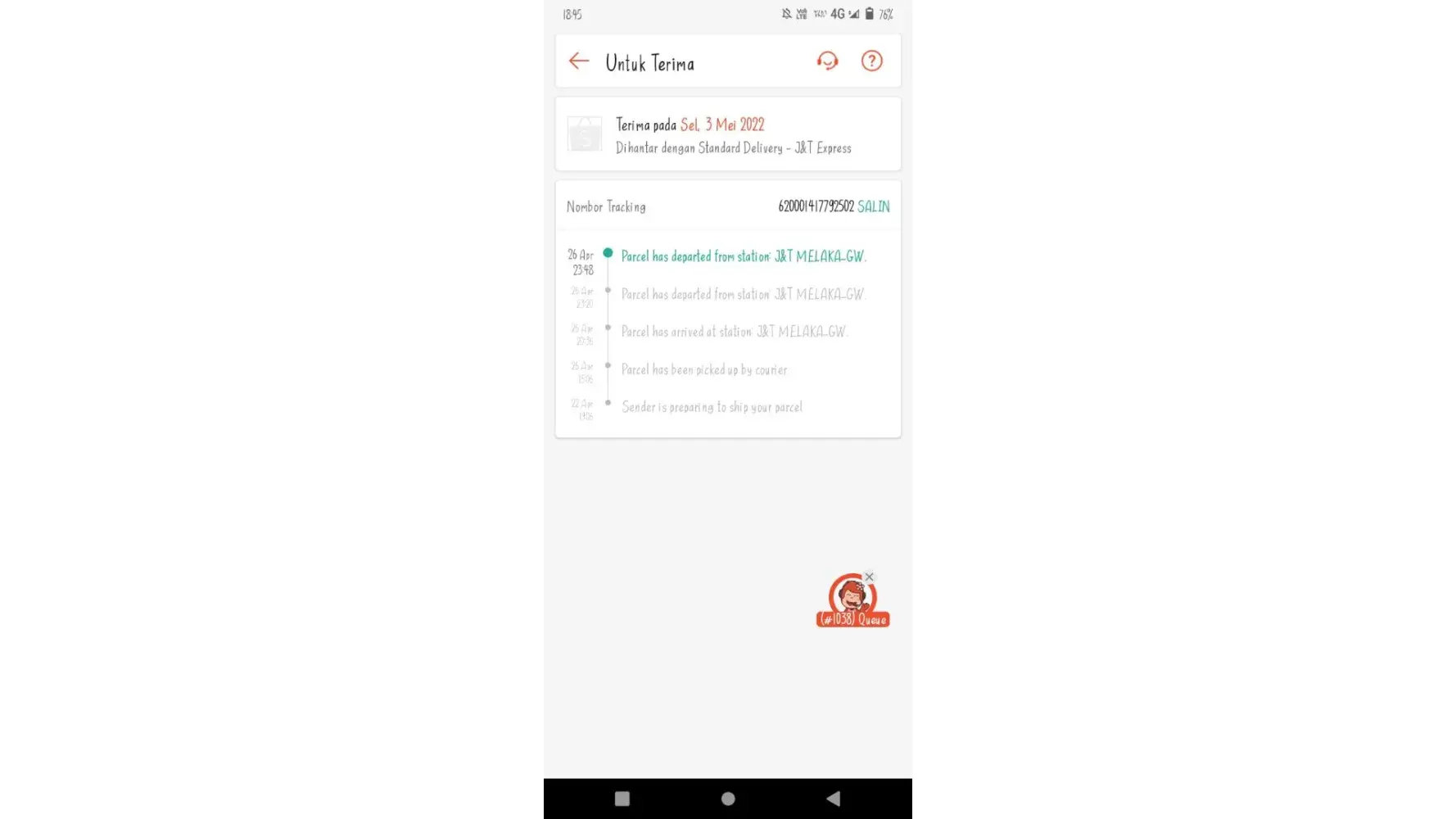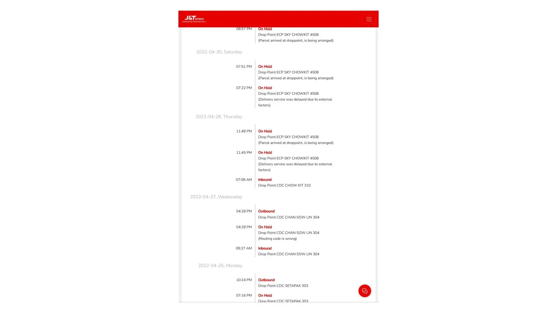 22 April 2022 - 26 April 2022 (still stuck at J&T MELAKA-GW