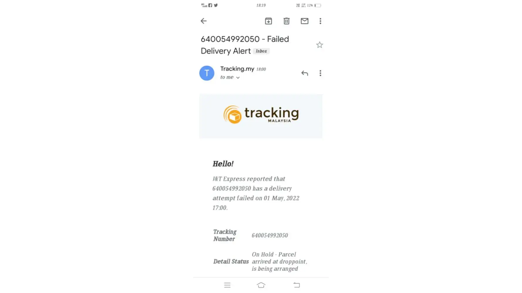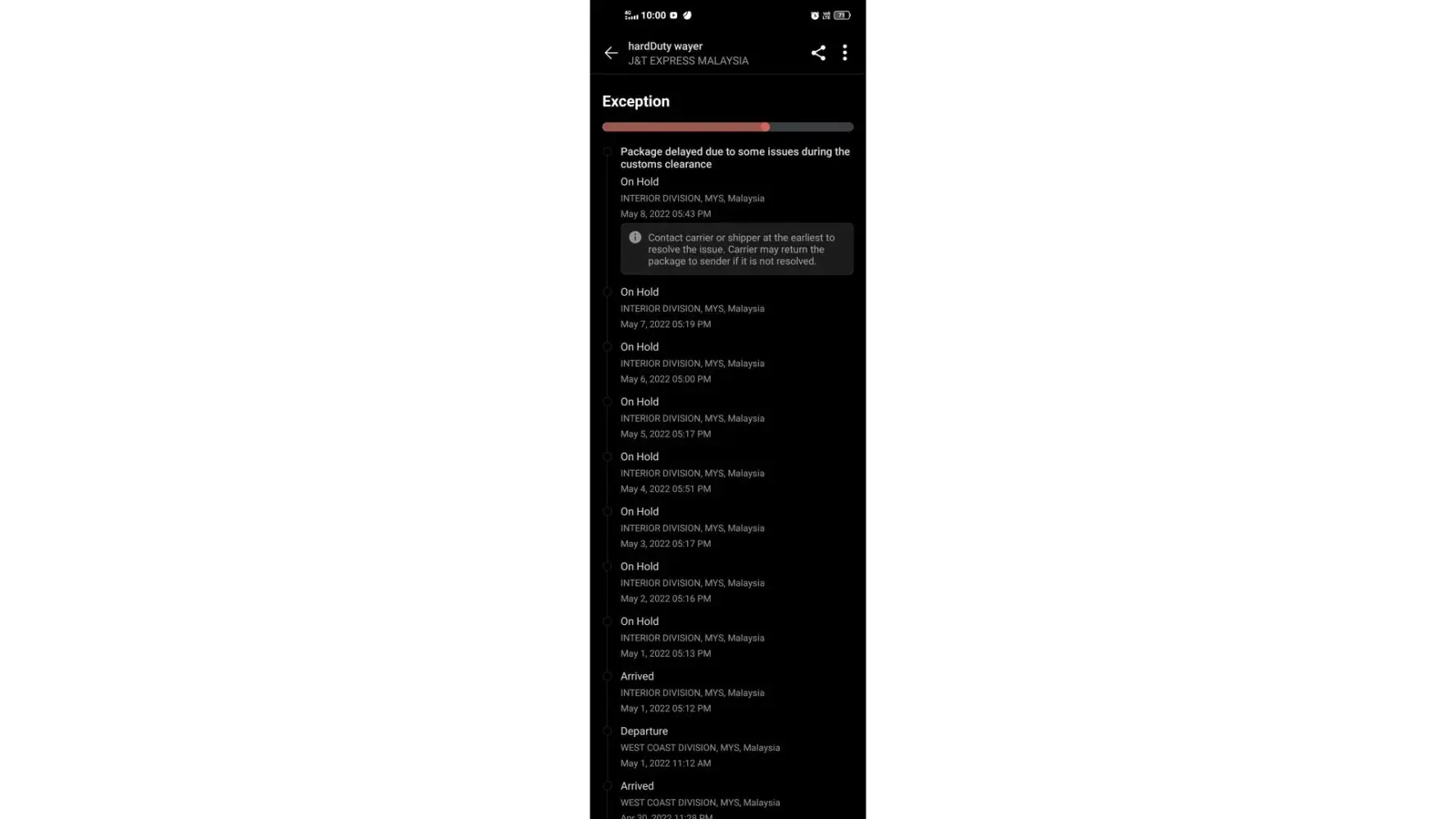 My parcel is being on hold since 29.04.2022 until today still yet to receive as per the status updated, submitted complaint to J&T Express complaint website still no responding, extremely lousy service.