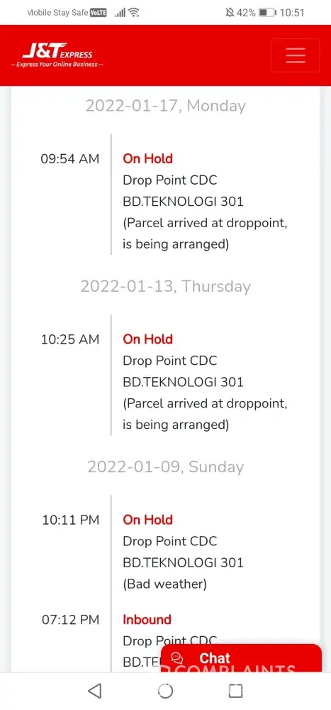 I have three parcels outbound from j&t CDC Ampang. On hold for two days. Fail attempts due to bad weather but actually not at all. Why no respond when i make call and want to chat with customer service. Call never answer. Almost 5 days already inbound and outbound. Very seriously bad services from j&t.