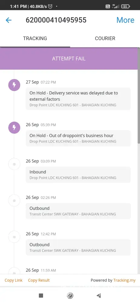 My parcel still on hold at J&T Bintulu for 4 days reason attempt failed, the service of J&T getting worst, parcel no. [protected]
