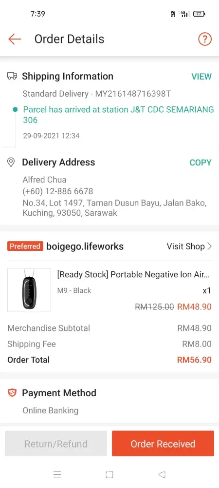 Pada 26.09.2021 saya ada buat penghantaran sebuah beg berwarna hitam melalui perkhidmatan j&t taman damansara aliff johor