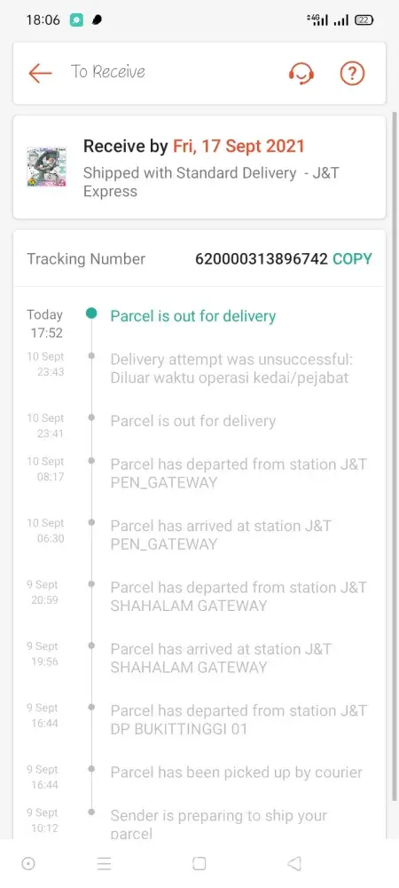 I ordered two things from two separate companies on Shopee on the same day. 31 August 2021. One of them departed from station J&T in Penang since 5 September and I still haven't received the parcel. I'm LIVING IN PENANG! How long is it going to take for a parcel to get from one place to another in the same freaking city? The other one is STILL on the way from Melaka from 1 September. When I tried to remind the orders on the app, it said invalid order numbers. How is that even possible? J&T is the worst. People always think POSLaju is bad but J&T is worse. At least if I send a parcel using POSLaju, I can know that the parcel will be delivered within three days. The trouble is, NO ONE IS DOING ANYTHING ABOUT THIS. Might as well just close the company and move on. Let other company do the deliveries because clearly, J&T doesn't have what it takes to do it properly.