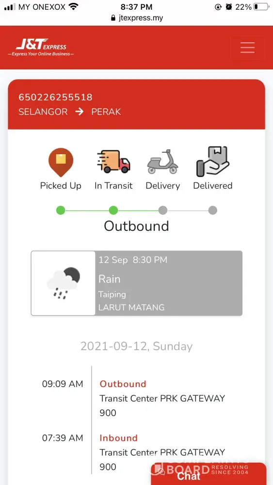 The tracking number is [protected] and the postcode is 36800. It supposed to be sent to Perak Tengah district but it's being brought to Larut Matang district, PRK 900. J&T Express, please send to the right address and postcode because the parcel contains food. Which I'm afraid it might going to turn bad if it's not arrived in the nearest time. Plus, I've read reviews that parcels tend to stuck at the hub PRK 900 for a really long time. And that's not good since my parcel contains food.