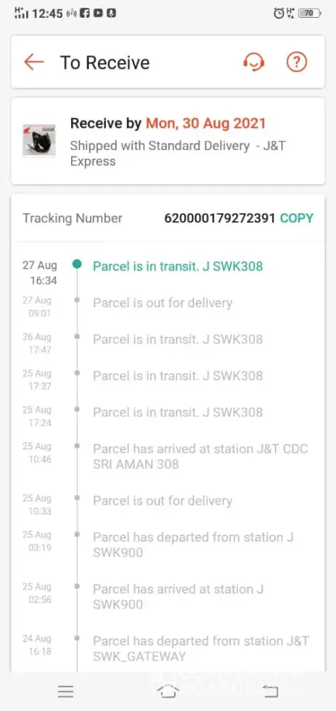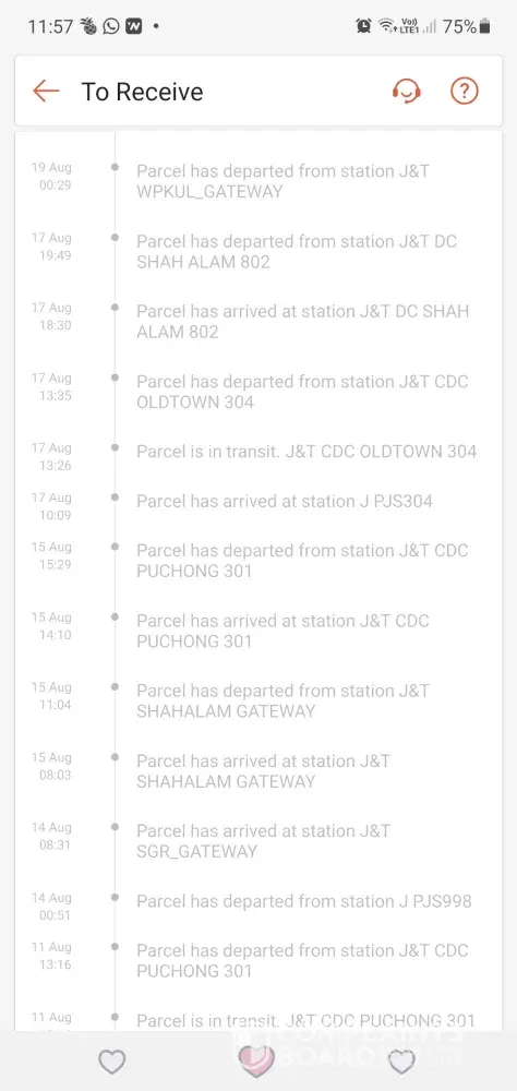 Delivery status still not updated since 20 August. Barang tersebut telah di hantar pada 13 August dan sehingga kini masih belum diterima. Sudah melebihi 2 minggu barang tersebut sama masih belum terima. Barang tersebut telah tersangkut lama di SBH_GATEWAY sehingga kini masih belum di update oleh pihak j&t. Saya berharap agar pihak j&t dapat memberi perhatian terhadap barang ini dan segera menghantarnya