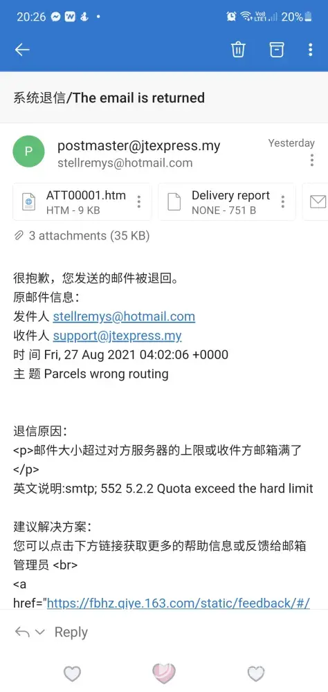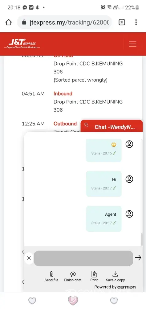 Hi, I am encountering bad performance from J&T Selangor, Malaysia. Kindly check the above tracking numbers. As you can see, the parcels are encountering unusual event. They have been routed here and there in circular. The sysyem stated wrong routing code. May I know is this some sort of failure in parcel handling? The address is clearly stated but still wrong sorting happens. This is not the 1st time I encounter the same issue. I've contacted hotline couple of times but couldnt reach, I've sent email but it bounced back, I've contacted via Live Chat but no respond from agent. Therefore I decided to file complaint here. I really hope J&T could provide a solution for user but not shut user out when facing problem. Please help.