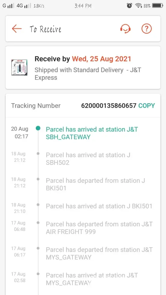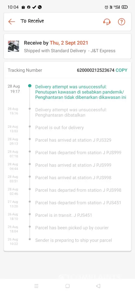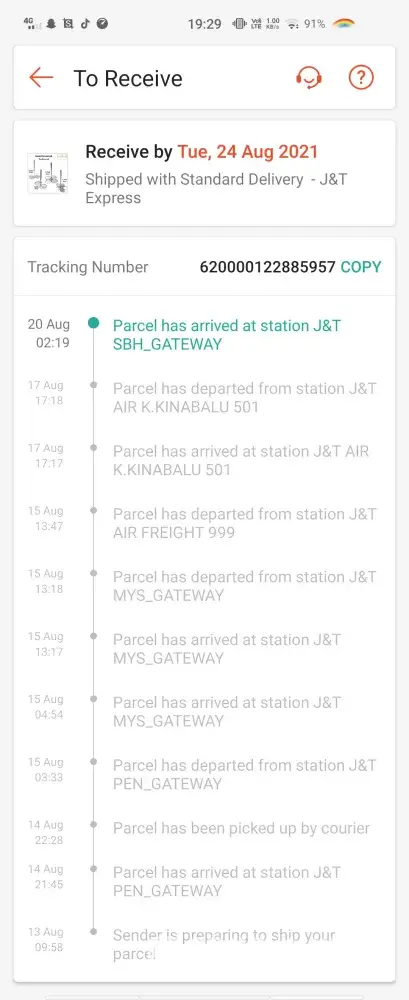 8.8 beli barang, sampai 29.8 pun belum sampai, alasan yang diberi ialah kes covid, tetapi barang lain yang bukan pakai J&T dah sampai selepas 3 hari. Katakan station di Klebang menghadapi sanitiz barangan, perluke ambil masa sehingga begitu lama? Kecewa sangat tindakan yang diambil oleh J&T, harap kedai2 shopee jangan lagi deal dengan shopee, ingin sangat batalkan pembelian sahaja...