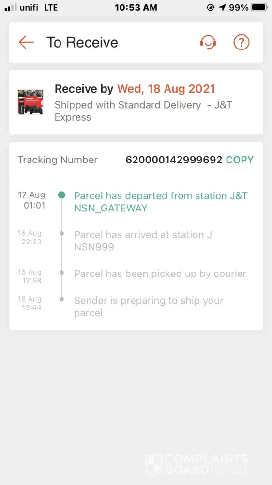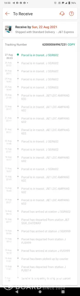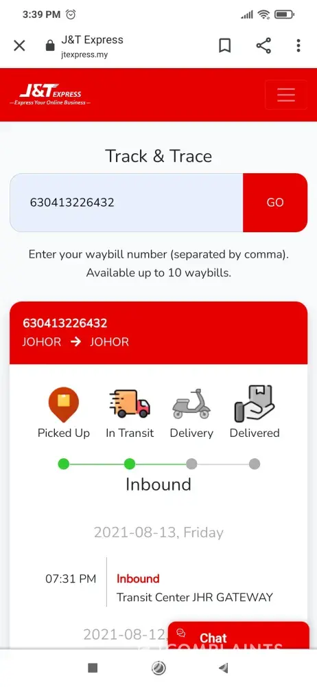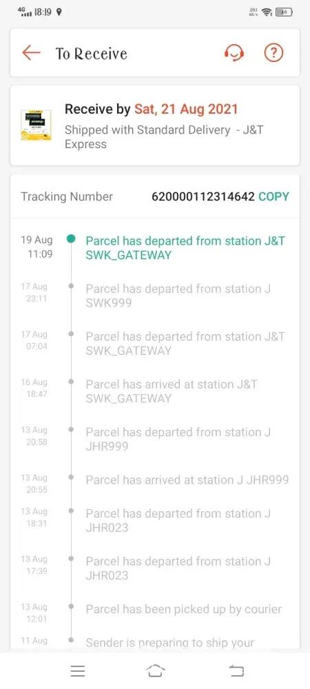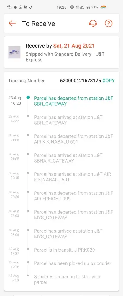 Saya telah membuat pesanan pada 13 ogos yg lalu dan sepatutnya barang diterima pada 21 ogos yg lalu, namun barang tersebut masih belum diterima sehingga sekarang dan tracking barang tersebut tiada perubahan bermula 20 ogos sehingga hari ini. Saya berharap agar pihak j&t dapat memberi perhatian dengan barang yg masih belum sya terima sehingga hari ini.