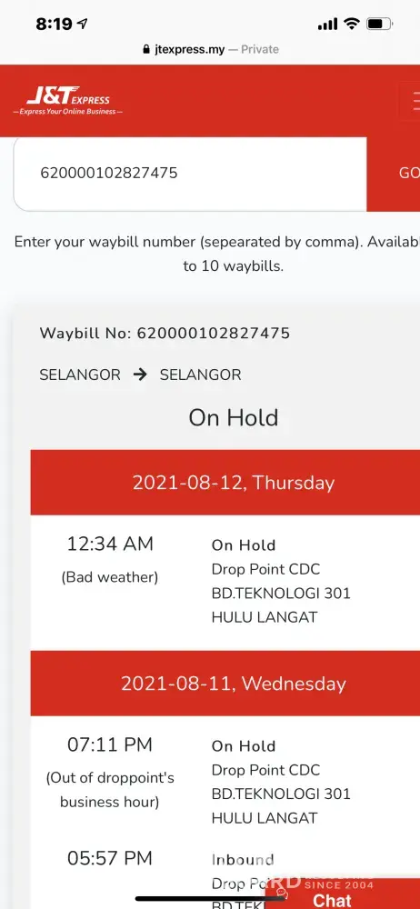 I would like to know the reason why J&T Shah Alam on hold my parcel since 11th August 2021. It's written in the tracking system because of Out of shop / Office's business hour. The parcel should be delivered to my family's house. So, how come it is out of shop? My parents is not working and there is always have someone at the house. The parcel was sent from Kelantan since 10th August but till today (13/8/2021) it was still on hold at J&T Shah Alam? How come it took so long to deliver? While my other siblings in Kajang and Bangi already received the same parcel 2 days ago, the same day it was post out to me. The foods inside the parcel might already rotten by now. PLEASE EXPLAIN TO ME!