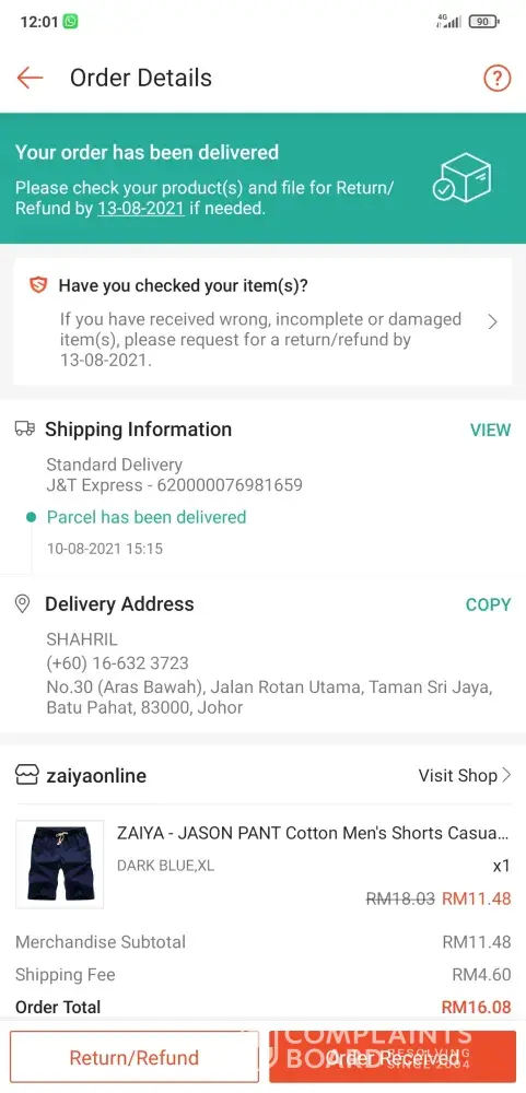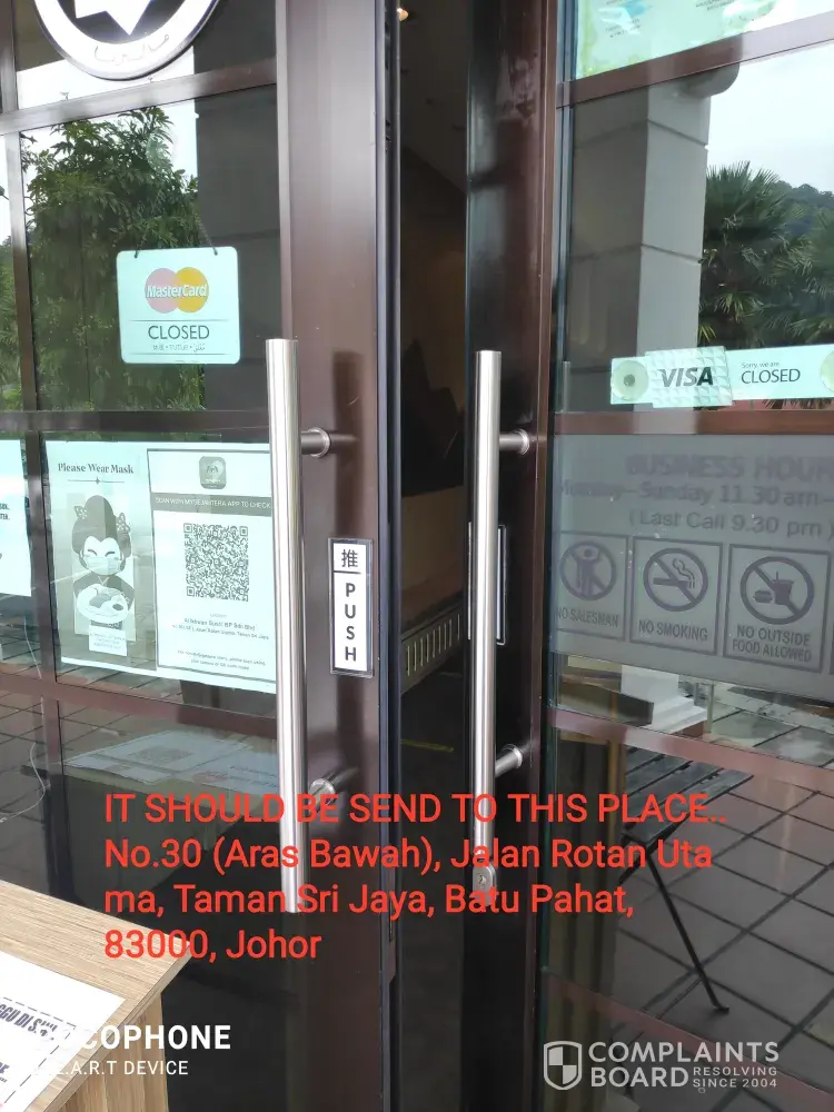 I would like to complain about item that your crew delivered. It seems my item had not reached to my place address No.30 (Aras Bawah), Jalan Rotan Utama, Taman Sri Jaya, Batu Pahat, 83000, Johor.
