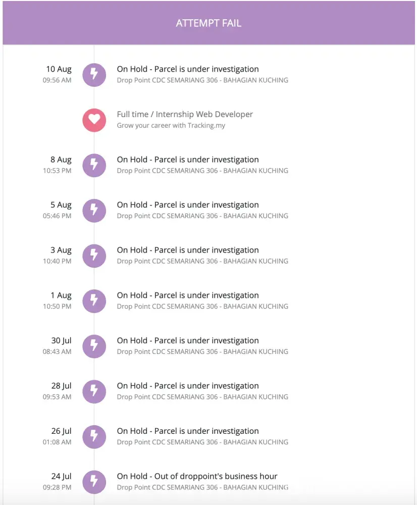 I have package that was shipped from Klang, and was due to arrive mid July. While it did arrive in Kuching mid-July, it was stuck under investigation since 26th July.