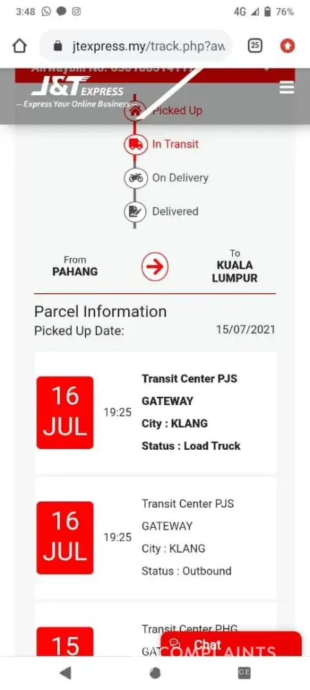 Barang saya dari 8/7/2021 tak sampai-sampai lagi.sudah lun masuk bulan baru.Dan tracking selalu kemaskini barang di transit pjs301. Saya nak walk in tak boleh disebabkan PKP.. Jarak dari rumah 28 minit.Saya ada hubungi j&t pjs301 tak ada respon, Saya hubungi hotline dan mereka dah hantar report ke j&t berkenaan, tapi sampai sekarang pihak mereka tak ada apa2 tindakan.