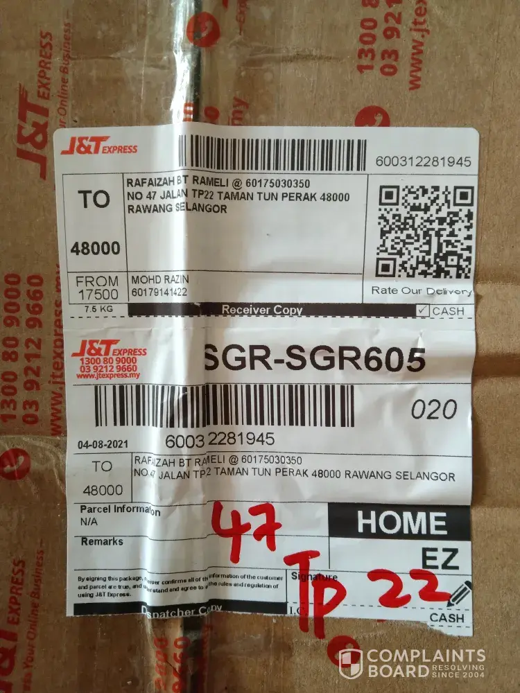 Saya mohd aszeri bin mohamad seller dr jb.. Harini 06/08.2021 jam 4ptg telah menerima aduan dr customer sy di pahang atas nama noraini bte abdul rahman [protected] bahawa parcel yg hendak diterima dr curier telah rosak/pecah. Customer sy membuat keputusan utk tidak menerima parcel tersebut & dibawa semula oleh pihak curier jnt..