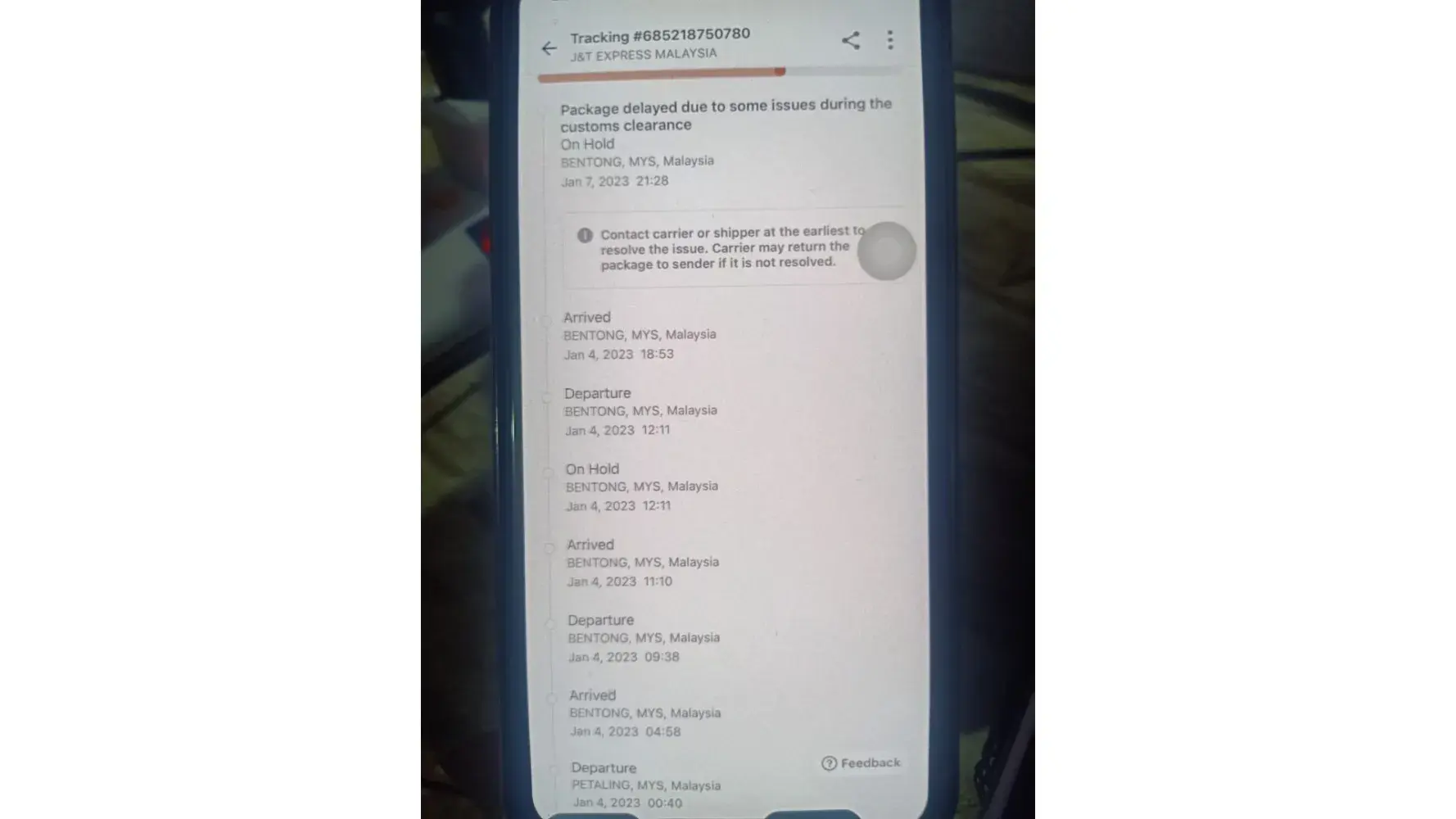 Parcel dh sampai dari 4jan onhold sampai ke hari ni xsampai2.. Mesej xde update tak keluar dari 4jan sampai kat cdc 315 bentong tu.. Apa masalah sampai nk kene siasat plk parcel tu? Sbb malas nak buat kerja ke mcmn? Call tak berangkat selalu bermasalah la cdc 315 bentong ni.. Dapat notification exception? Apa hal ni? Nak kata jalan ke bukit tinggi ni tutup xde plk hujan lebat xdelah sampai banjir jalan tu xboleh sampai.. Please la