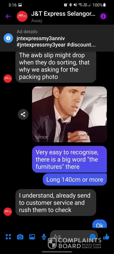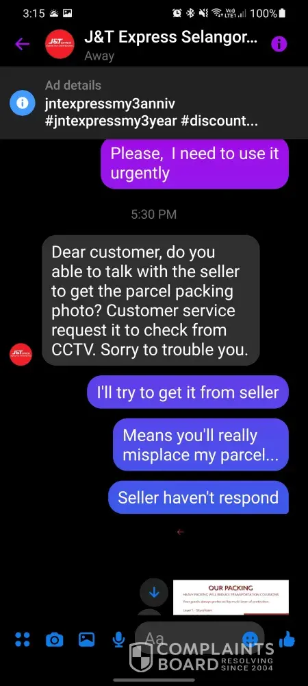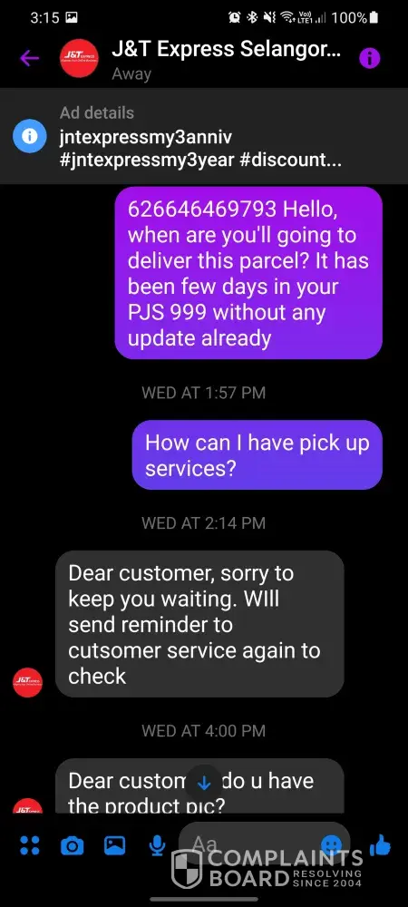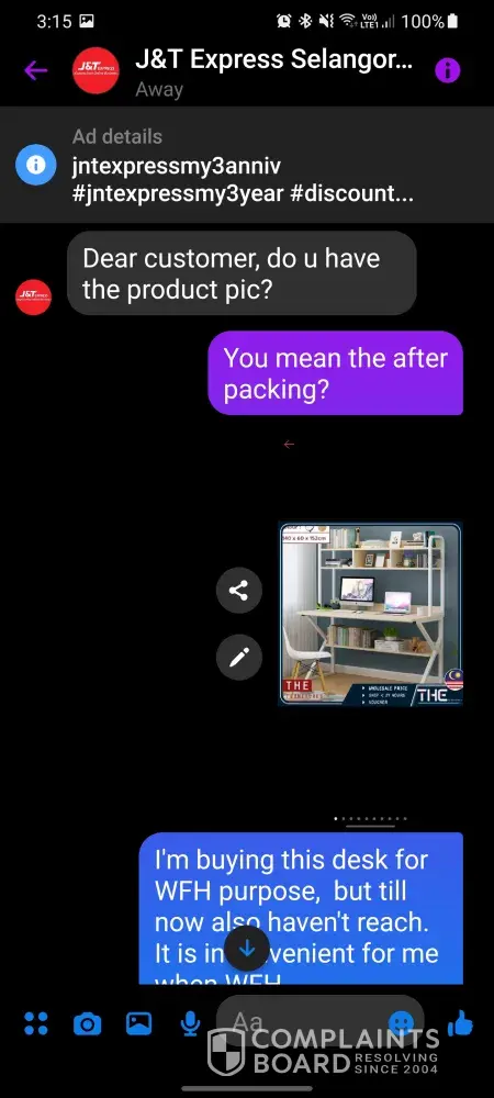 I have purchase a writing desk through Shopee on 14th July 2021 night and J&T has collect the said parcel on 15th July 2021 from the seller. Tracking system show that the parcel has reach J&T PJS 998 on 16th July 2021 and it don't have any update until now. Try to contact J&T with they live chat numerous times but no 1 respond to my enquiry. Call them they all me to seemed whatapps, and when I send whatapps they want me to request refund. No 1 is try to solving the problem at all. At the end manage to contact their facebook page admin and the admin request the parcel packing photo from seller. I've suspect they have lost my parcel. Cause they say have to check their CCTV to find my parcel.