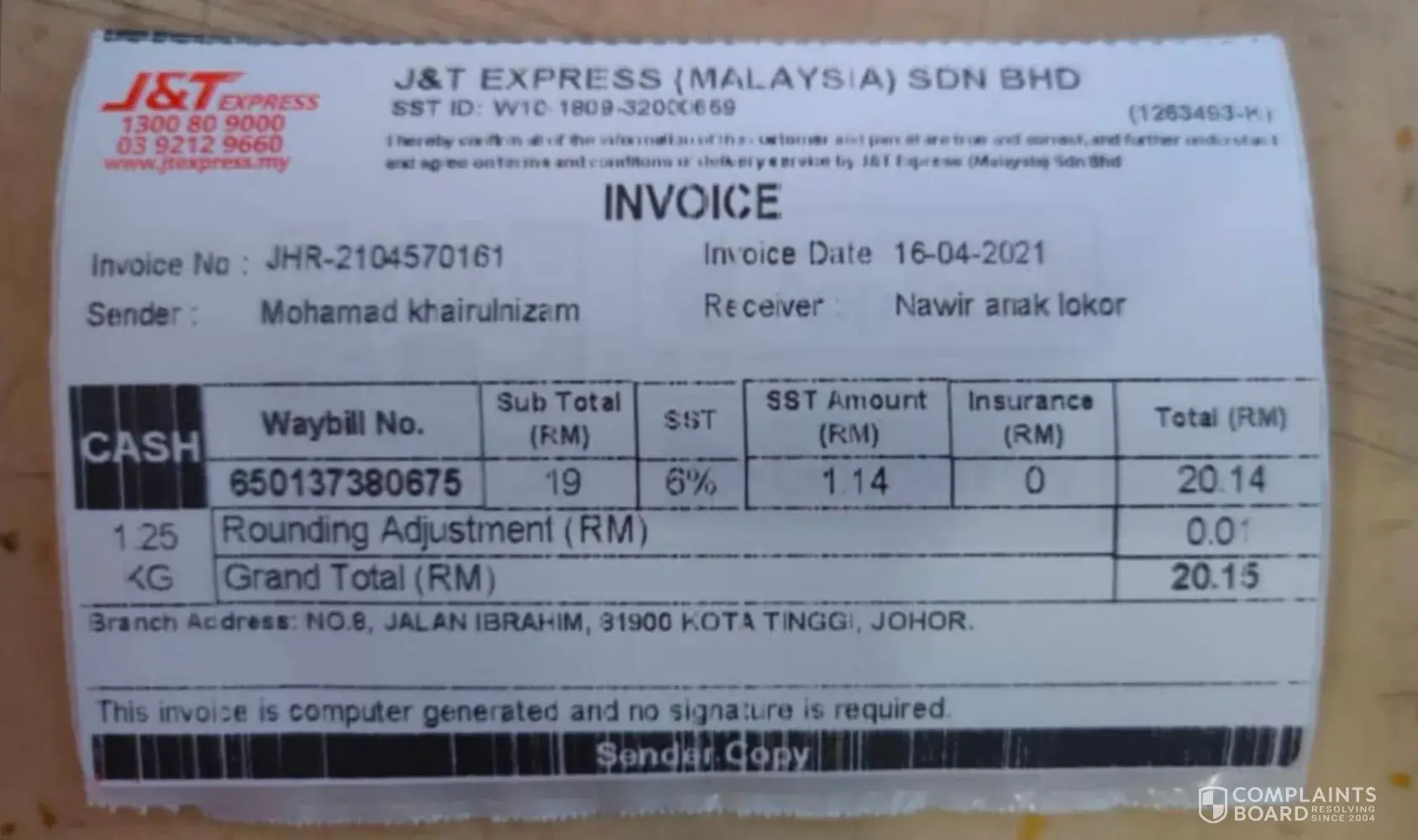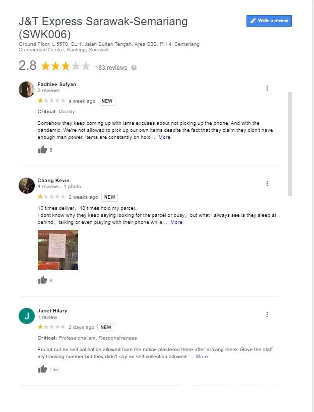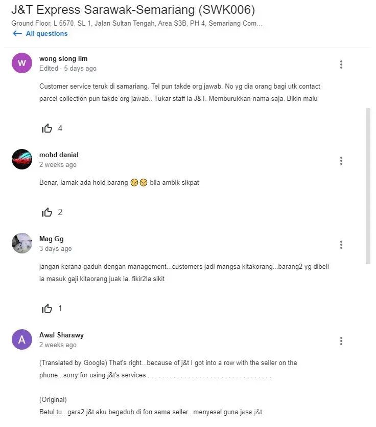 parcel dipos bernombor [protected] pada 16/04/2021 melalui Jnt Express Kota Tinggi, Johor ke Kuching Sarawak tetapi sampai sekarang barang tidak di terima oleh penerima. sudah 3 bulan 7 hari. saya semak dalam sistem J&T barang tersebut ada dekat gudang CDC Kuching 301, Sarawak. saya sudah menghubungi J&T customer service beberapa kali dan memaklumkan kepada mereka dan mereka mengatakan barang ada di scan dan out untuk delivery dan jawapan itu adalah jawapan yang sama setiap kali saya mengubungi dan bertanyakan tentang barang saya. tetapi tidak dihantar juga. saya cuba menghubungi pihak J&T CDC Kuching 301, tetapi tidak ada maklum balas dan panggilan tidak dijawab. jadi sekarang saya tidak tahu status sebenar barang saya sama ada masih ada dekat gudang atau tidak. saya semak CDC Kuching 301 dalam google banyak sangat komen negatif. saya harap pihak J&T Express Kuching 301 akn lebih bertanggunhjawab dan amanah melalukan kerja. barang pemilik adalah hak pemilik dan pemilik berhak menuntut semula.saya harap pihak tuan/puan memandang serius dengan situasi dan tindakan harus diambil. sekian terima kasih.