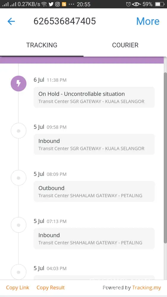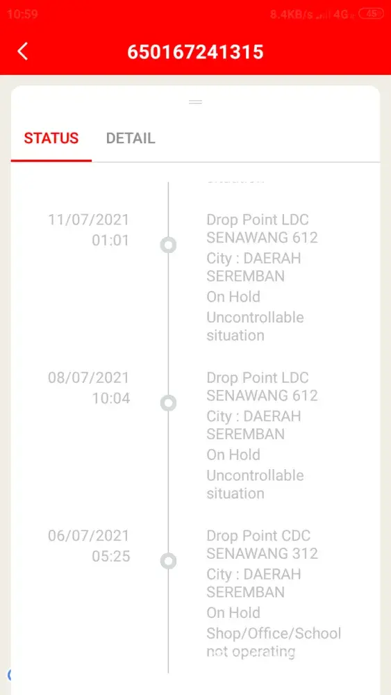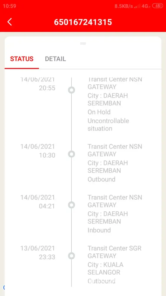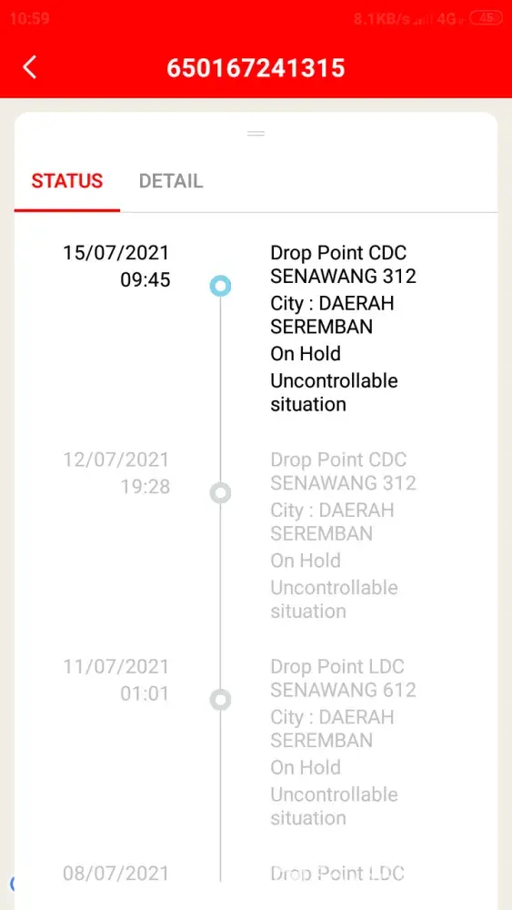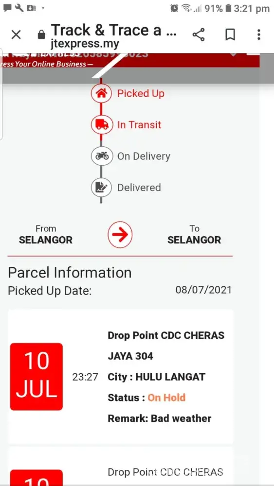 Idk what's the reason to on hold, it shows there uncontrollable situation. There's is no raining, no any other bad weather or what, what is the uncontrollable situation? The staff and workers are lazy? Cuz I read through the google review about the j&t express at seri kembangan, all the reviews are bad and talking about how the staff's laziness and irresponsible. THE SERVICE IS SO BAD! Even my grandmother can move faster than the delivery services! It's not good to use j&t anymore. It's good when it just started but now when it's getting longer, it become worse.