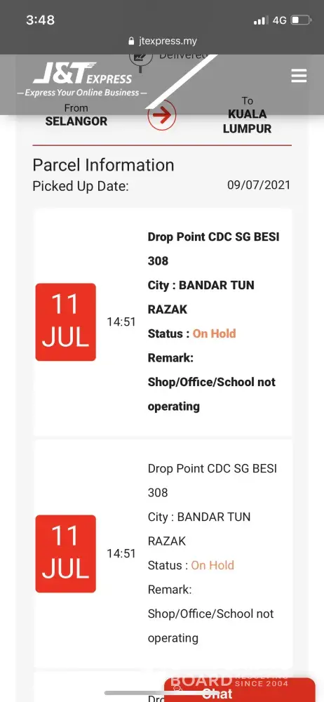 Apa yg terjadi pada J&t kuala selangor? Barang saya sepatutnya sampai 9 julai 2021 tetapi sampai sekarang masih belum sampai. Barang dipos pada 5 julai dan on hold di kuala selangor dari 6 julai, sekarang dah 11 julai tetapi masih belum berganjak. Harap sangat-sangat pihak J&t dapat menyelesaikan masalah ini dengan cepat agar barang dapat sampai dengan masa yg telah ditetapkan. Tolong sangat supaya J&t tidah menyimpan barang pelanggan lama sebab akan menyulitkan lagi masalah kepada penerima dan pemberi kerana kadang kala kami membeli dari Shopee dan masalah ini akan terganggu bagi pihak penjual dan pelanggannya sekiranya penghantaran lambat sampai. Terima kasih atas kerjasama pihak J&t