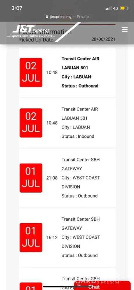 Saya pun sama, hantar 29 Jun, sampai sekarang masih di Air Labuan 501. Called J&T hotline, suruh saya call balik satu minggu. Call lagi J&T hotline, sama respon suruh saya call balik satu lagi minggu. Dah 3 minggu call berturut-turut, respon pun sama