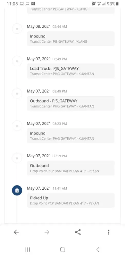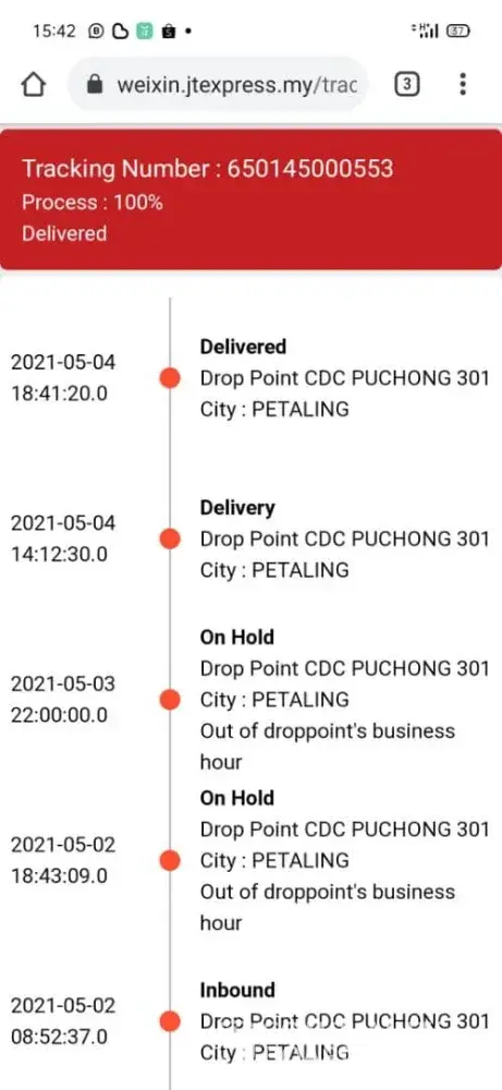 Merujuk kepada consignment no : [protected]. Pada 7/5/21, saya pergi ke J&T Express untuk membuat penghantaran barang dari Pekan, Pahang ke Klang, Selangor. Keesokan hari saya menyemak status penghantaran, menunjukkan bahawa parcel saya sudah tiba di Port Klang (8th May 2021). Tetapi, pada 8/5/21 tidak sampai hantar ke tempat yang dituju. Sebaliknya, melalui J&T tracking no menunjukkan "On Hold - Out of droppoint' business hour" pada 8/5/201 & 9/5/2021. Barang ini dipegang di Port Klang selama dua hari.