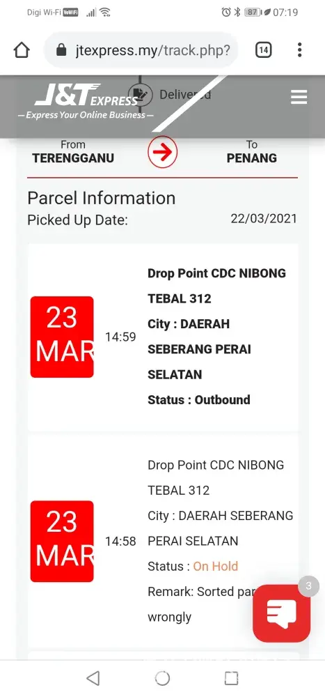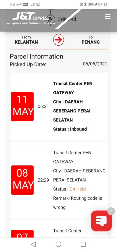 I went to J&T Express to courier a parcel from Ipoh to Penang on the 6th May 2021. Next day I check the status it shows the parcel is at Kuala Muda (7th May 2021) already. Then the update keep remaining on 7th May 2021 until today.