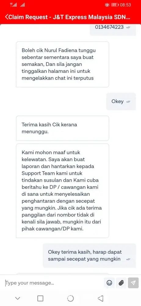 Berharap Pihak J&T dapat memberi penjelasan terhadap kelewatan dan pampasan kerosakan barang.
